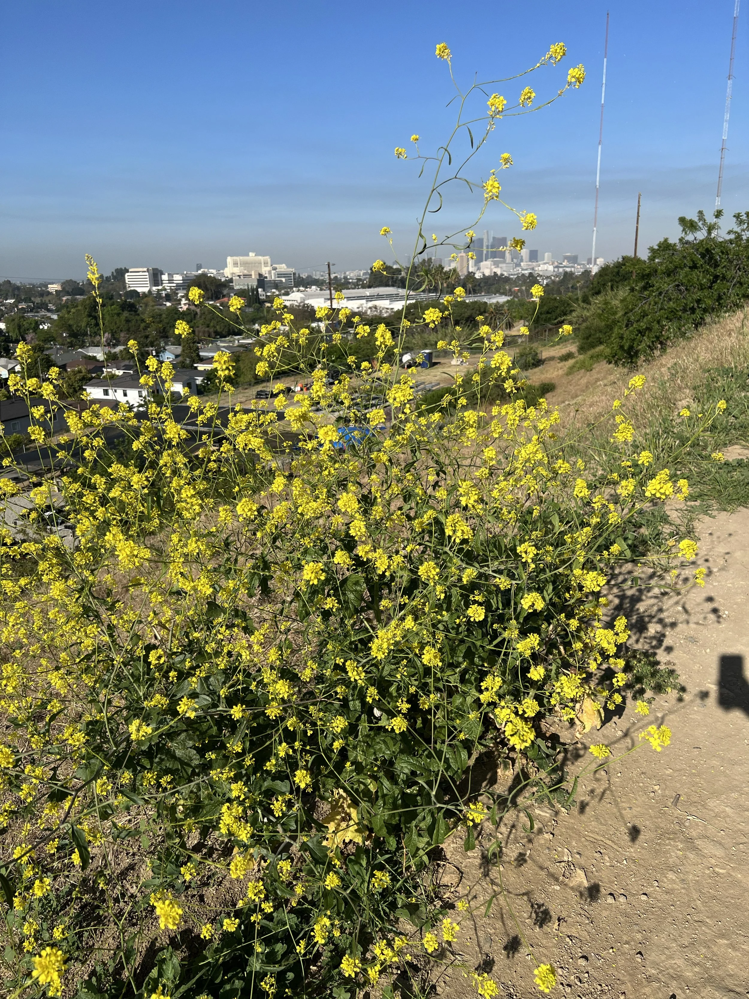 Black Mustard (Brassica nigra) is an annual herb that can grow up to 4-8 feet tall. It has bright yellow flowers with four petals arranged in a cross shape.